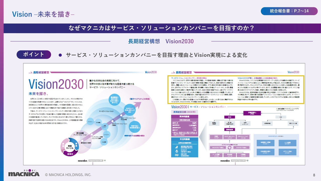 今回の統合報告書では、Vision2030を「未来を描く部分」として位置づけ、その実現に向けた「今」を創る活動を、今年度から始まった中期経営計画を中心に解説していきます。