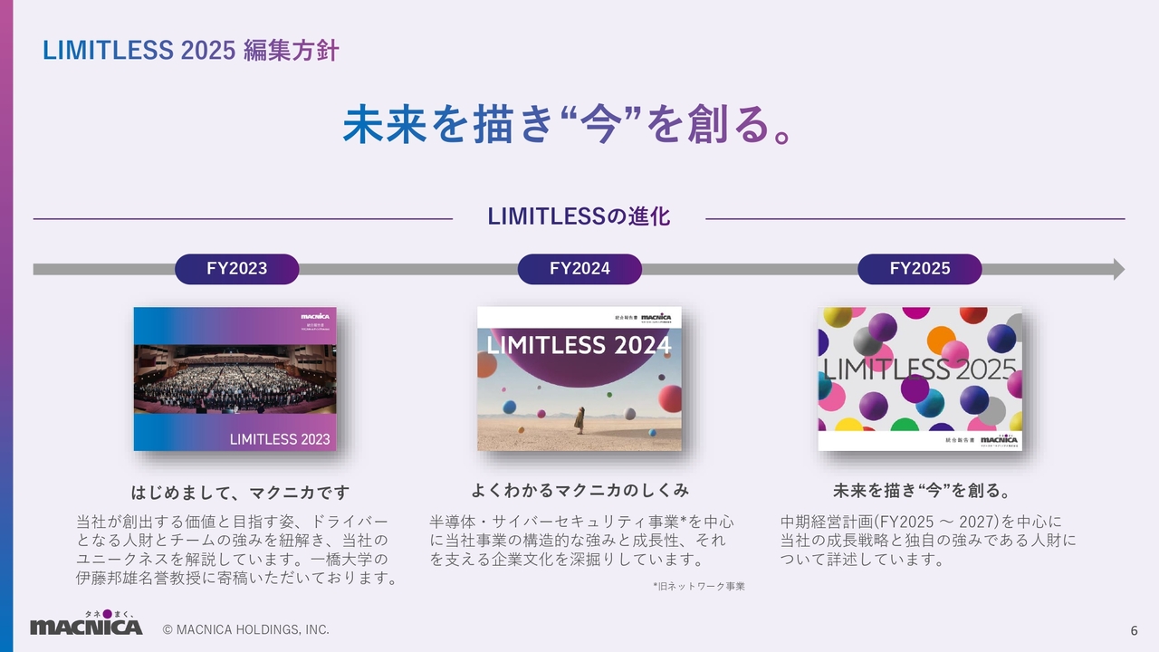 昨年度は「よくわかるマクニカのしくみ」をテーマに、半導体やサイバーセキュリティ事業の構造的な強みと今後の成長性について深掘りしました。そして、今年は「未来を描き“今”を創る。」をテーマに制作しています。この言葉は、当社のパーパスにも含まれている重要な一節です。