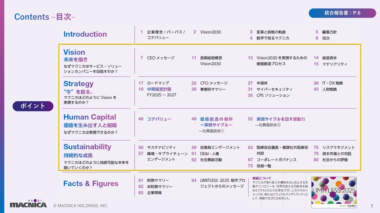 「LIMITLESS 2025」のポイントは、まさにこの構成です。今回の統合報告書は6つのセクションで構成されていますが、特にVisionからSustainabilityの4つのセクションが、マクニカの未来と、その実現に向けた取り組みを深く掘り下げる中心的なパートになっています。