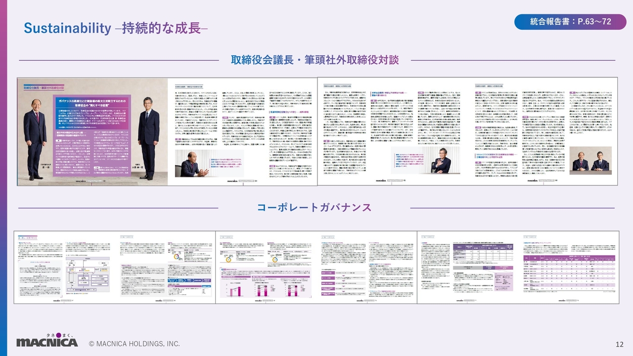 司会者:今年の統合報告書では、取締役会議長と筆頭社外取締役による対談記事やコーポレートガバナンスに関するページもあります。ぜひ統合報告書の63ページから72ページをご確認ください。