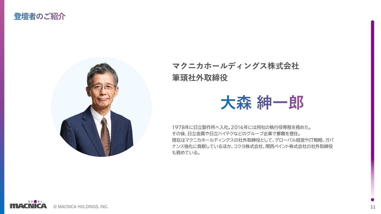 司会者:第2部「社外取締役が語る、マクニカの現在地」へと移ります。第2部の登壇者は、マクニカホールディングス株式会社、筆頭社外取締役の大森紳一郎です。大森取締役は、日立製作所へ入社後、同社の執行役専務を務められ、その後は日立金属、日立ハイテクなどのグループ企業で要職を歴任されました。