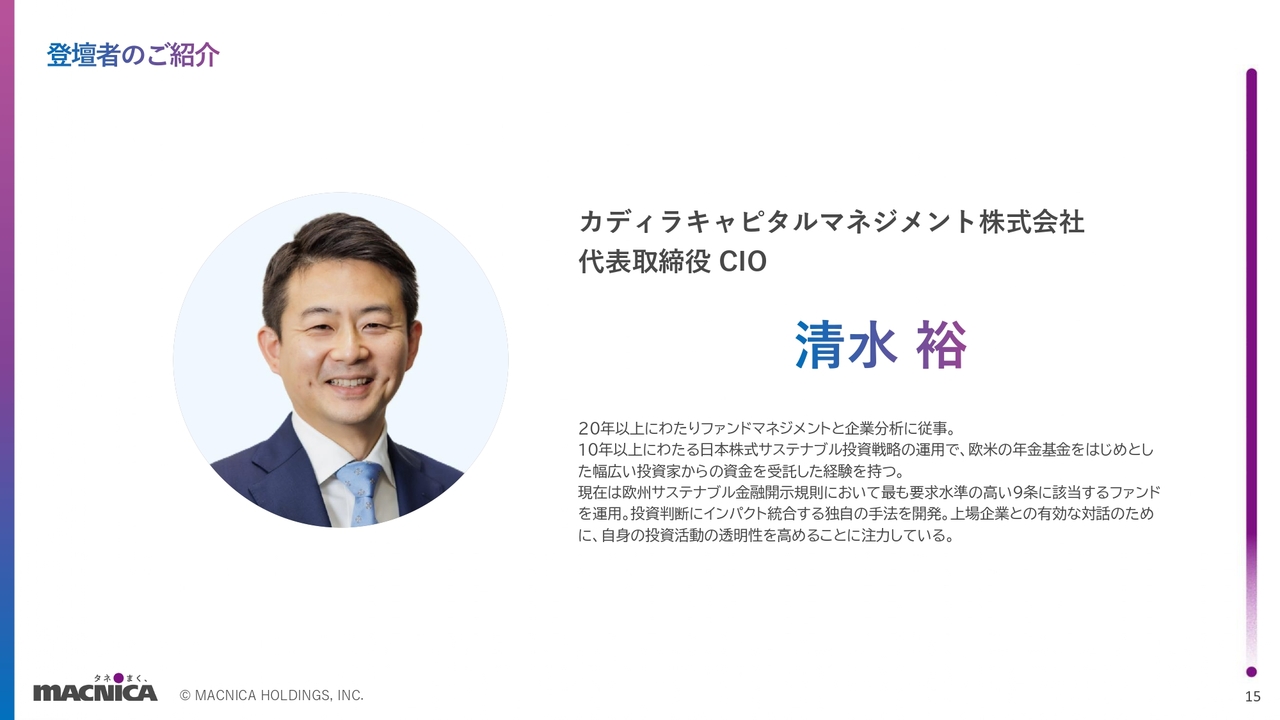 司会者:続いて、清水さまのご紹介です。清水さまは、20年以上にわたりファンドマネジメントと企業分析に携わってこられました。日本株式のサステナブル投資戦略においては、10年以上の運用実績を持ち、欧米の年金基金など幅広い投資家から資金を受託されています。