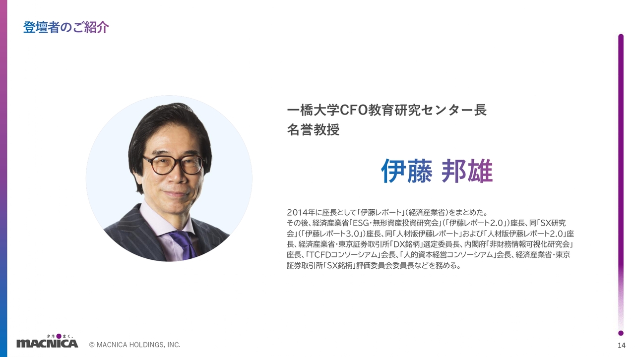 まずは登壇者をご紹介します。一橋大学CFO教育研究センター長・名誉教授の伊藤邦雄先生です。伊藤先生は、日本企業の企業文化とガバナンスの専門家です。2014年に経済産業省の「伊藤レポート」を取りまとめて以来、ESG、人的資本、サスティナビリティ、DXなどのさまざまな分野で政策提言をリードされてきました。