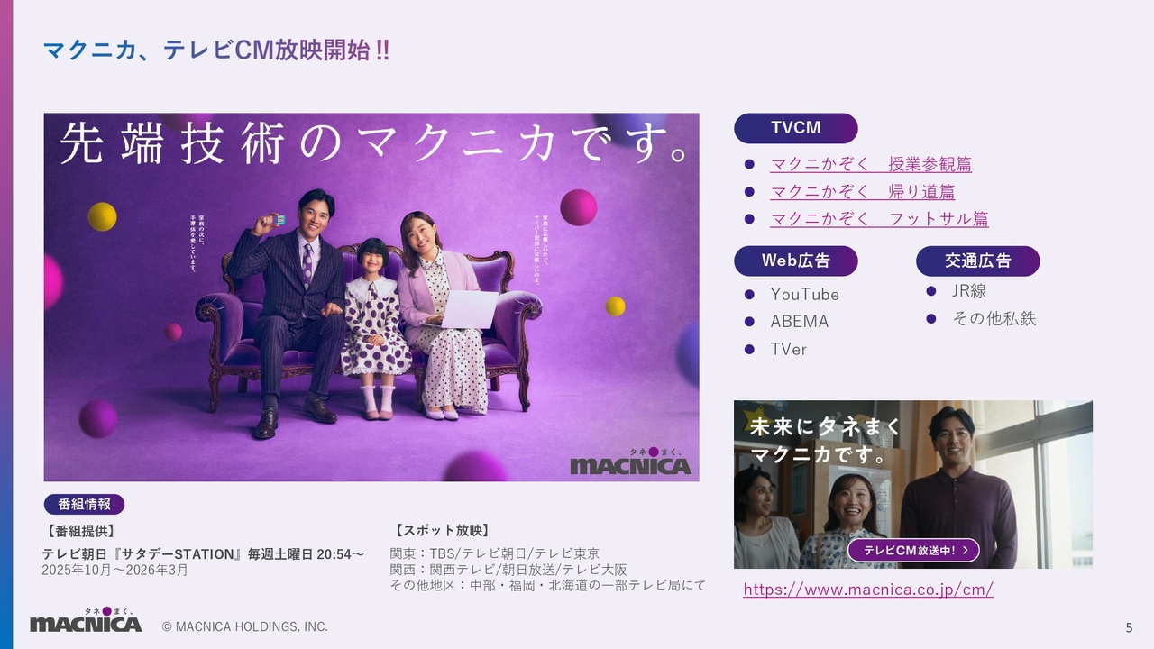 原:まず、当社の直近の取り組みについてご紹介します。10月4日より、当社の新しいテレビCMの放映が始まりました。昨年に続き2回目のテレビCMで、今回は「マクニかぞく」をコンセプトとして、3パターンのCMをリリースしました。