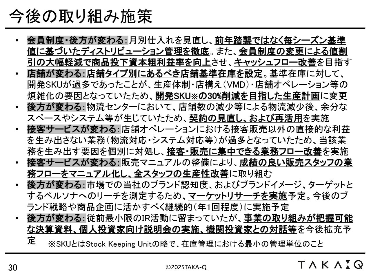 通常の30パーセントオフや20パーセントオフを中止した影響もあり、来店数が減少しています。この状況を踏まえ、さらなる戦略を打ち出す必要性を感じています。会員制度の変革に伴い、やるべきことがまだ多くあると思っていますので、一つひとつ取り組みを進めていく方針です。