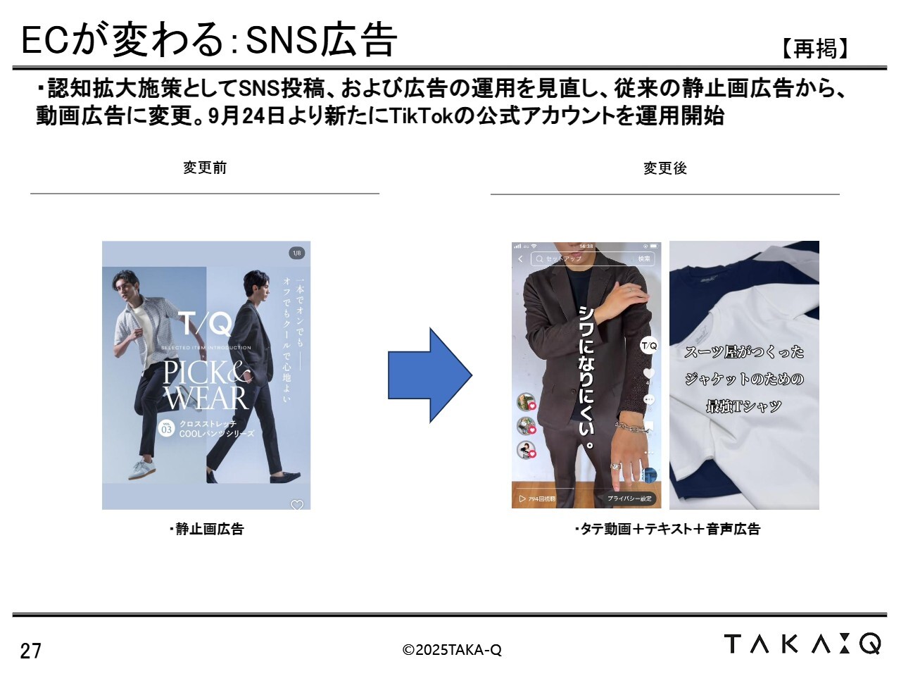 「ECが変わる」についてです。これまで、タカキューがほとんど取り組んでいなかった領域です。特段新しいものではなく、世の中では当たり前に行われているものだと思っています。これまで静止画広告のみを展開していた状況から、ようやくタテ動画や音声広告、テキストが入った形式などにも対応し始めたということです。
