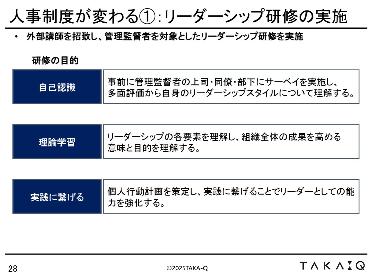 人事制度の見直しを進めており、リーダーシップ研修を実施しました。これから若手がリーダーとなる中で、その意識改革を図るため、人事部が中心となって改革を進めています。スライドに記載している内容に基づき、改革を行っています。