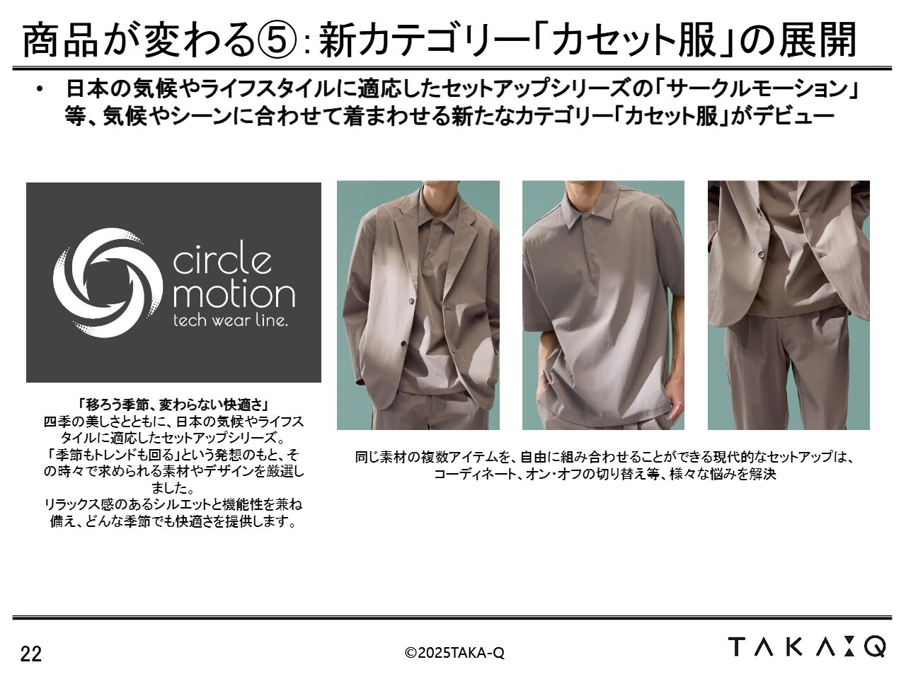例えば、「サークルモーション」は1つの素材でジャケット、インナーのシャツ、ボトムスなどのアイテムを、同じ素材でバリエーション展開し、それを1つのカテゴリとして考えています。その中で、さまざまな組み合わせやスタイリングが可能です。これを「サークルモーション」というかたちで新たに提案しています。