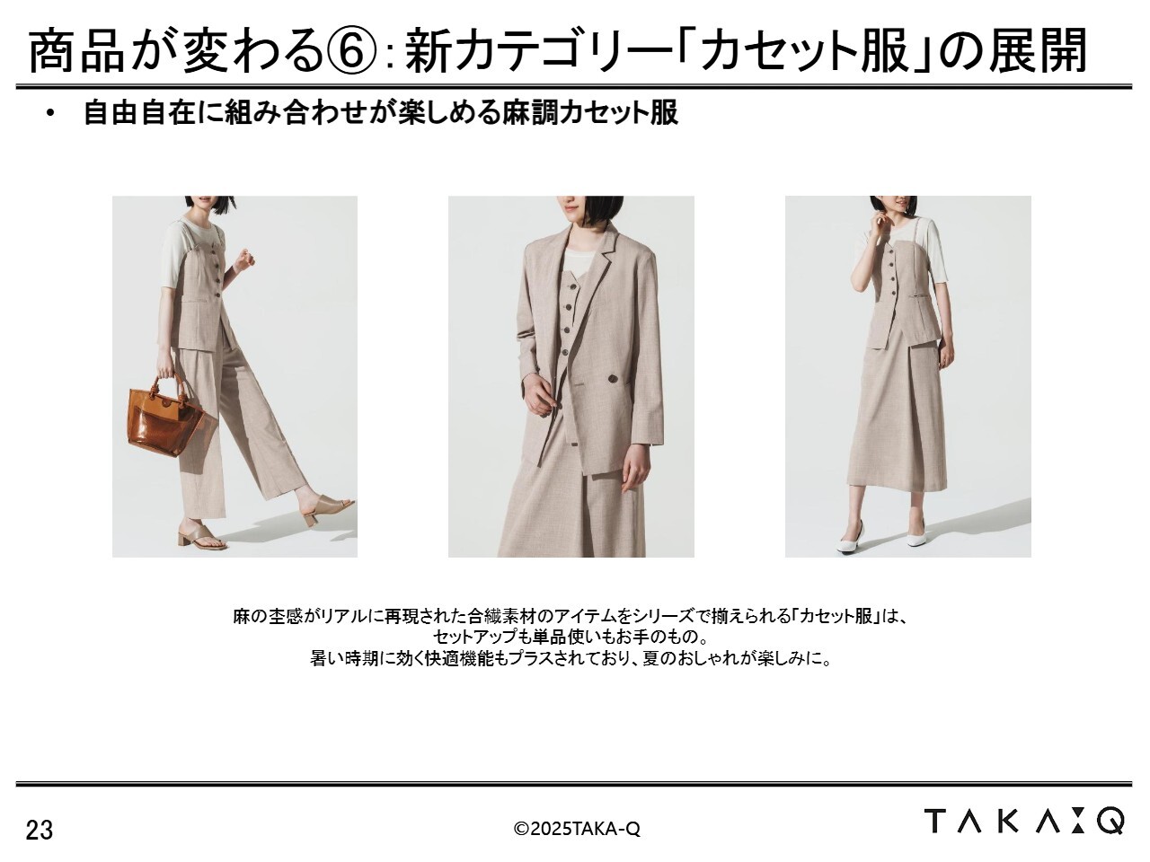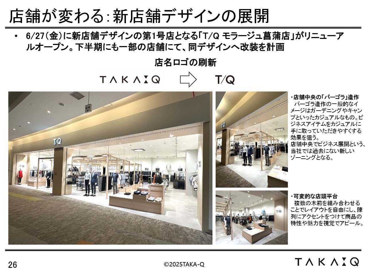 「店舗が変わる」についてです。先ほどの「T/Q」ではありませんが、1店舗ごとのブランドの見直しを行っています。今回は、越谷のレイクタウンにおいて、新たな試みとして「TAKA-Q」のメンズのみだったところにレディースも展開し、どのような結果をもたらすか検証しています。