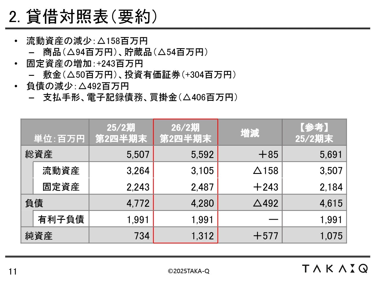 貸借対照表です。前年同期末比で流動資産は1億5,800万円減少しました。その内訳は、商品の減少が9,400万円、貯蔵品の減少が5,400万円です。なお、貯蔵品の大半は当社のオーダースーツ用生地の在庫です。固定資産は2億4,300万円増加しました。