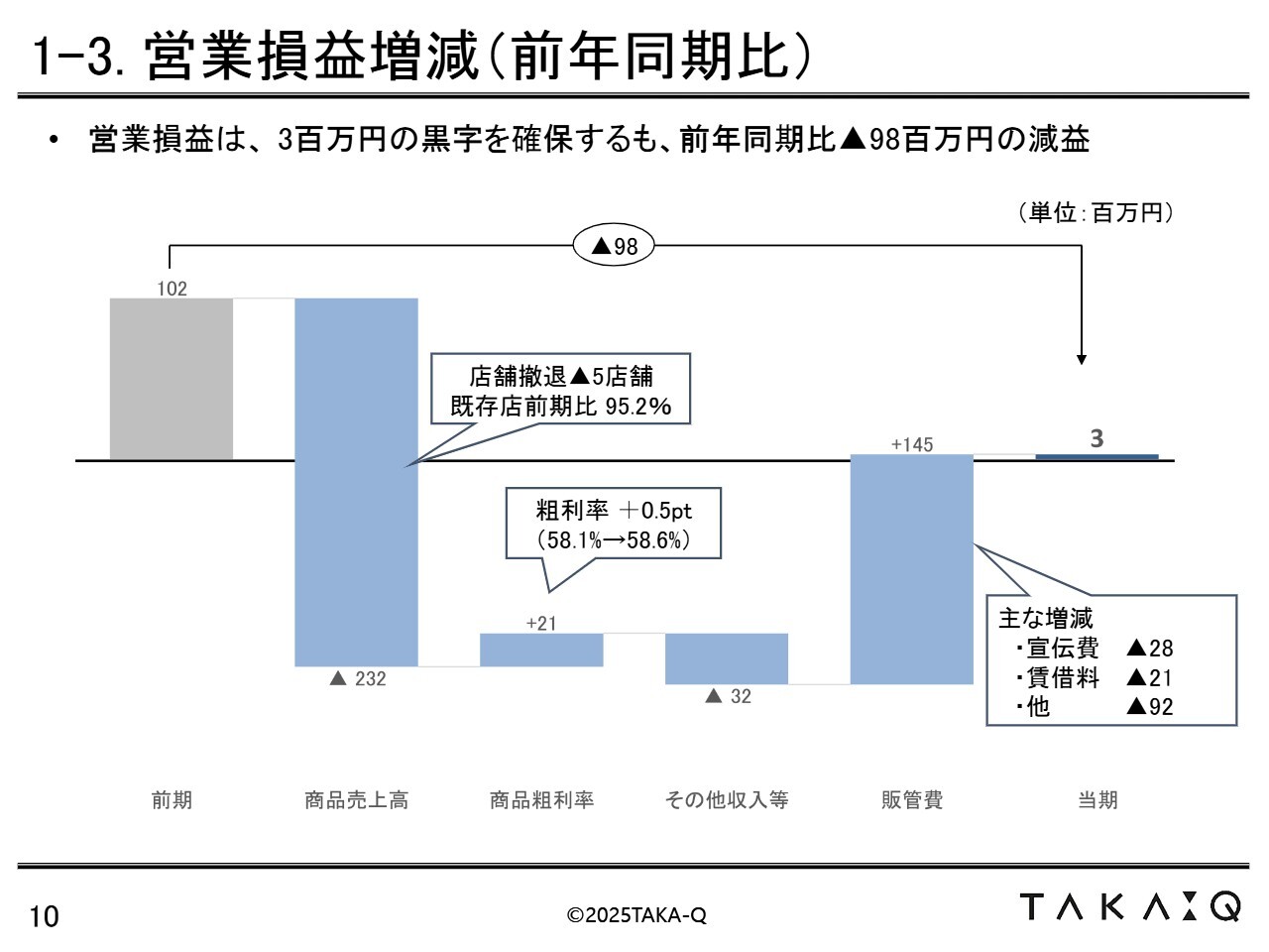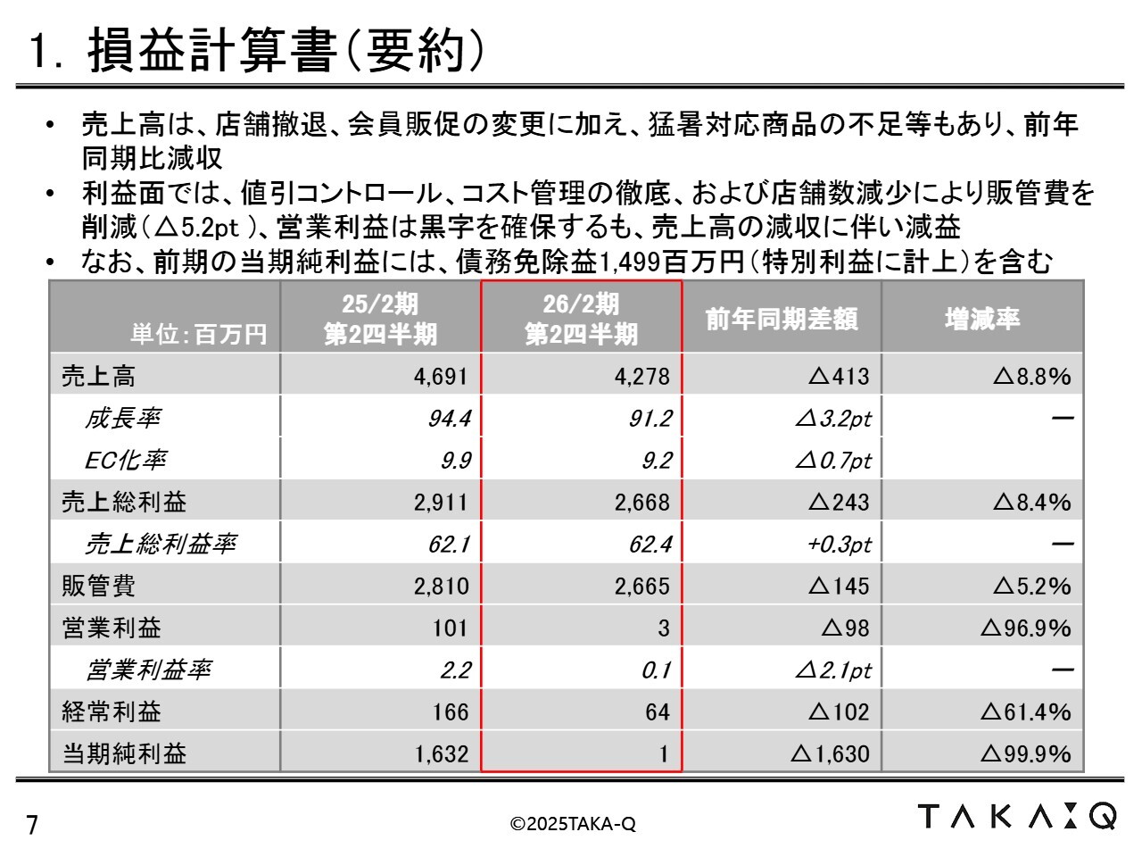 売上総利益高は26億6,800万円、前年同期比8.4ポイントの減少となりました。なお、売上総利益率は、販促値引きの抑制などにより0.3ポイント改善しました。販管費は26億6,500万円で、前年同期比5.2パーセント減少しました。
