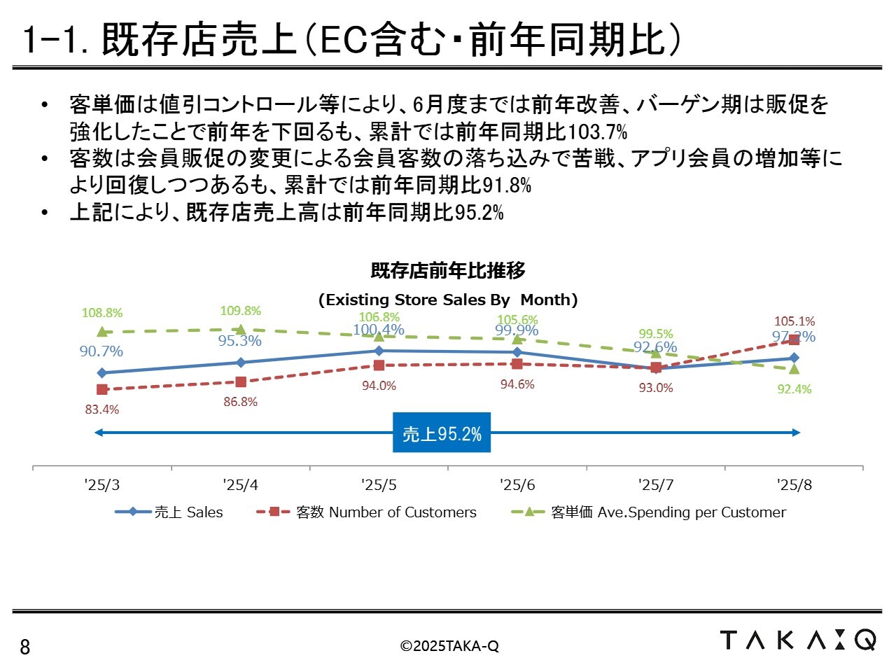 客数が減少した主な要因は、会員向け販促活動の見直しによる一部会員客数の減少です。2025年7月度には、想定以上の猛暑により、ドレスシャツよりもTシャツへの売れ筋がシフトしました。このため、猛暑関連の商品が不足するという事態も発生しました。