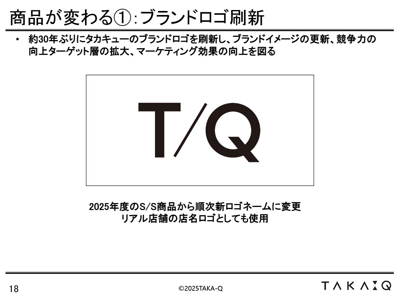 変更可能な店舗に関しては、改装店舗を含めて「T/Q」という名前に変更します。「TAKA-Q」の店舗については、店舗のロゴも変更しながら進めていく方針です。