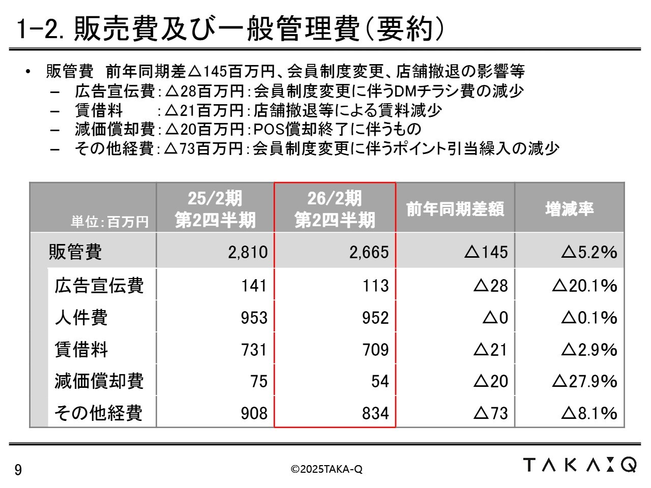スライドは、販管費の内訳です。主な減少要因として、広告宣伝費が2,800万円減少した理由は、販促DMを中止してデジタル販促にシフトしたことによる削減です。賃借料の2,100万円減少は、前期の店舗撤退によるものです。