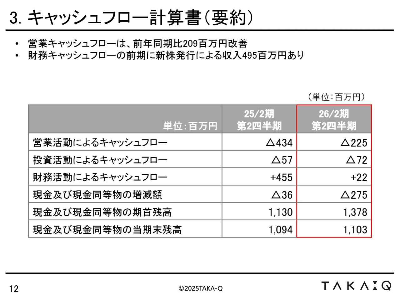 スライドは、キャッシュフロー計算書です。営業活動によるキャッシュフローは、前年同期比で約2億円改善しています。この主な要因は、棚卸資産の減少によるものです。結果として、現金及び現金同等物は機首から2億7,500万円減少し、当期末残高は11億300万円となりました。