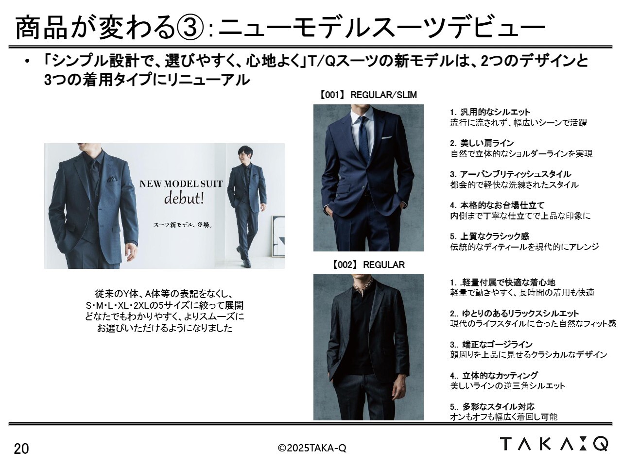 当社は、紳士服業界に属していますが、従来の紳士服業界とは異なる価値観を持っています。その中で、ファッションとしての側面や新しいスーツの開発を進め、新しいコンセプトの「T/Q」というブランドを含めた展開を目指しています。
