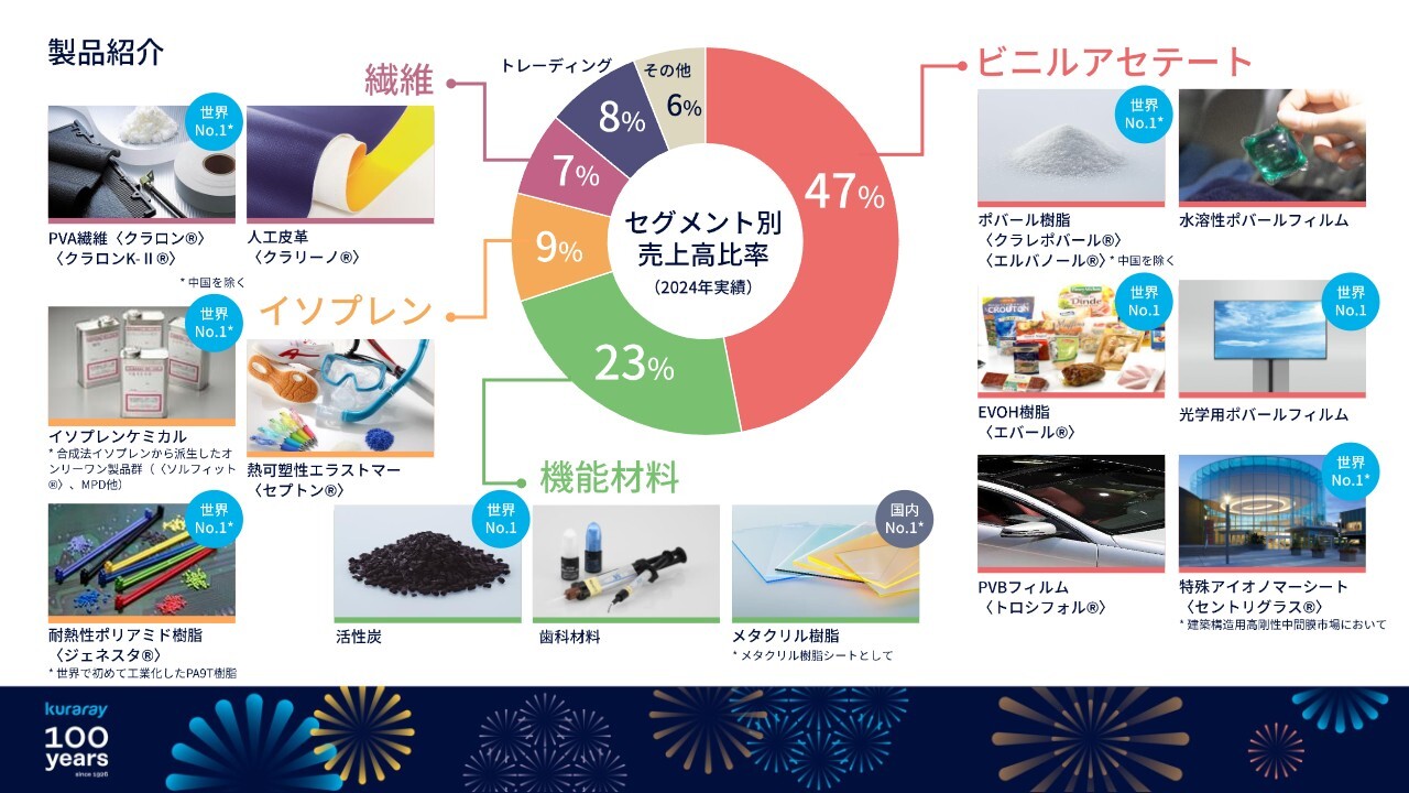 創立期のご紹介でも少し触れたPVA繊維であるビニロンを含む繊維セグメントは、当社の祖業ですが、ご覧のとおり、過去の事業ポートフォリオの入れ替えに伴い、現在の売上高比率は7パーセント程度と、かなり小さなものになっています。
