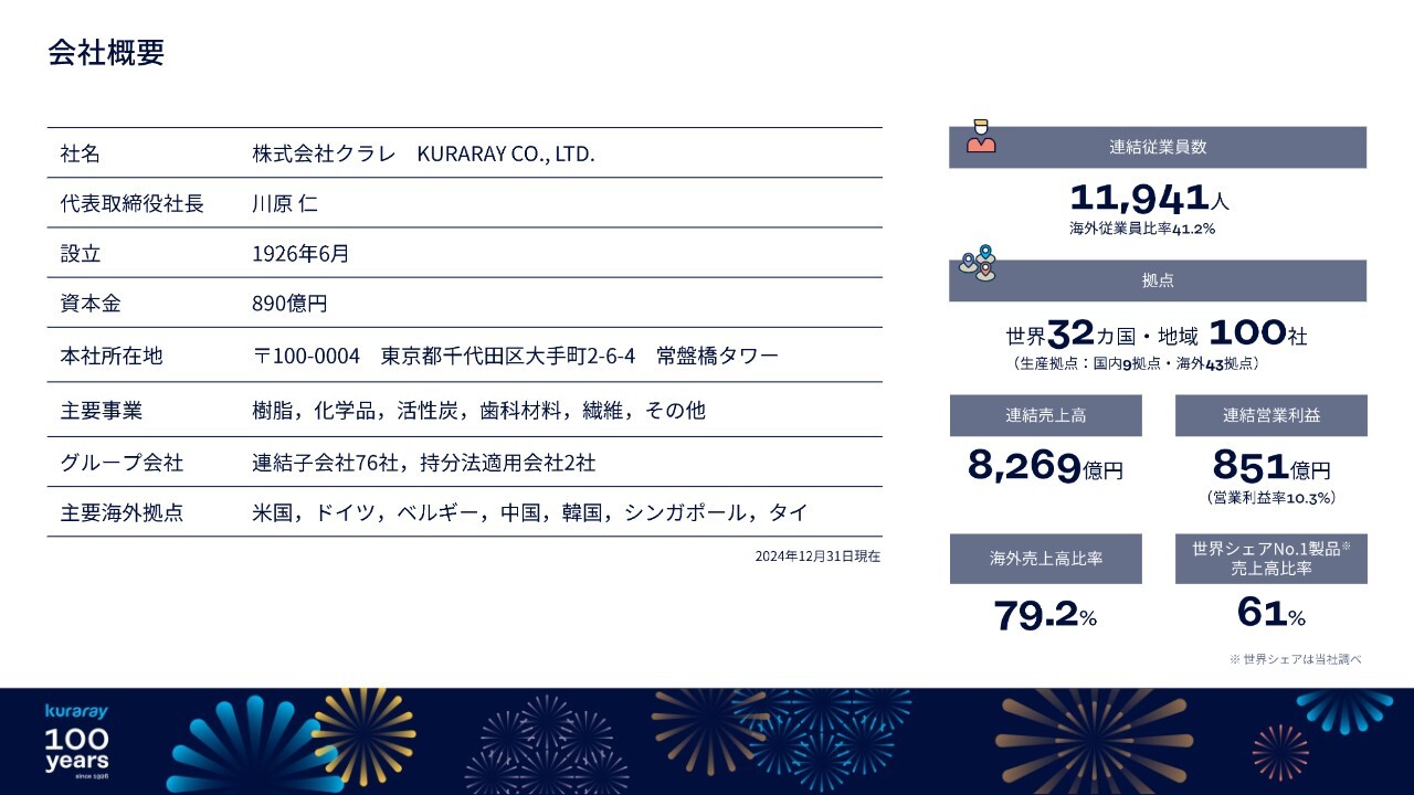 まずはスライドをご覧ください。当社は1926年に設立され、来年6月に創立100周年を迎えます。これを記念して社内外に向けてさまざまな発信を行っており、そのモチーフとして日本の伝統でもある花火をイメージしたデザインを使用しています。