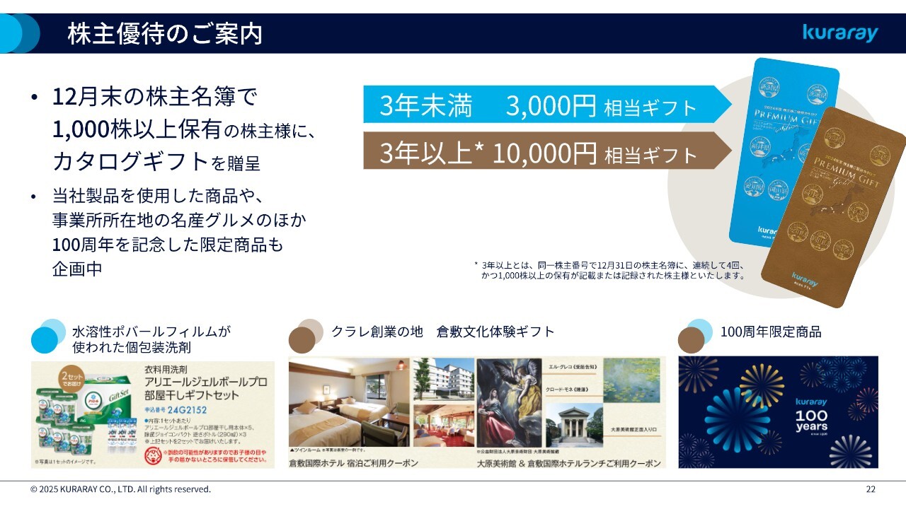 滝沢:株主優待についてです。当社は株主優待制度を設けており、12月末時点で1,000株以上保有の株主さまには、保有期間に応じて2種類のカタログギフトを贈呈しています。
