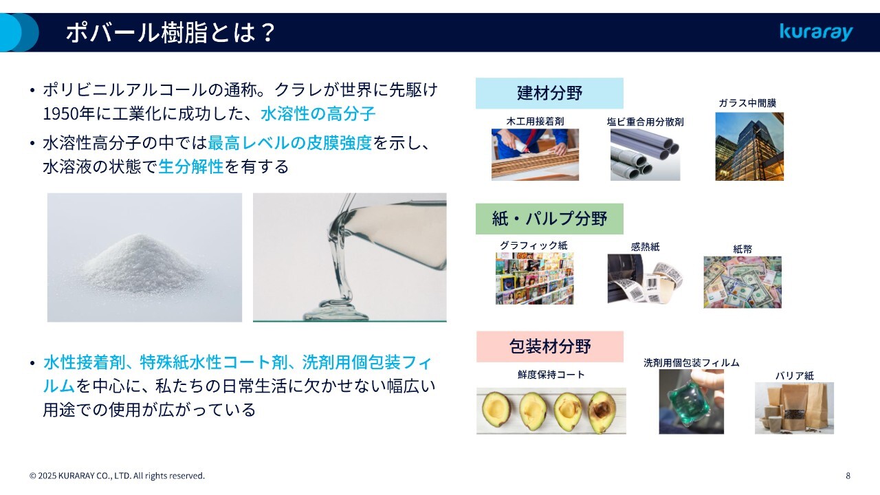 滝沢:スライドでは、当社の代表的な製品であるポバール樹脂の概要と用途展開を示しています。ポバールとはポリビニルアルコールの通称で、水に溶けるという特徴を持つ高分子素材のことです。