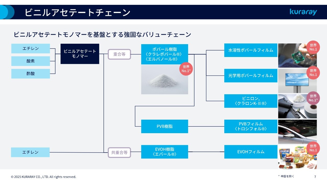 さらに、樹脂の原料であるビニルアセテートモノマー自体は、当社が販売する製品ではなく原料という位置づけです。原料まで一貫して生産することで、高いコスト競争力と安定供給を実現すると同時に、当社の高いシェアを持った製品群を含めて、強固なバリューチェーンを築いている点が、このビジネスの特徴となります。