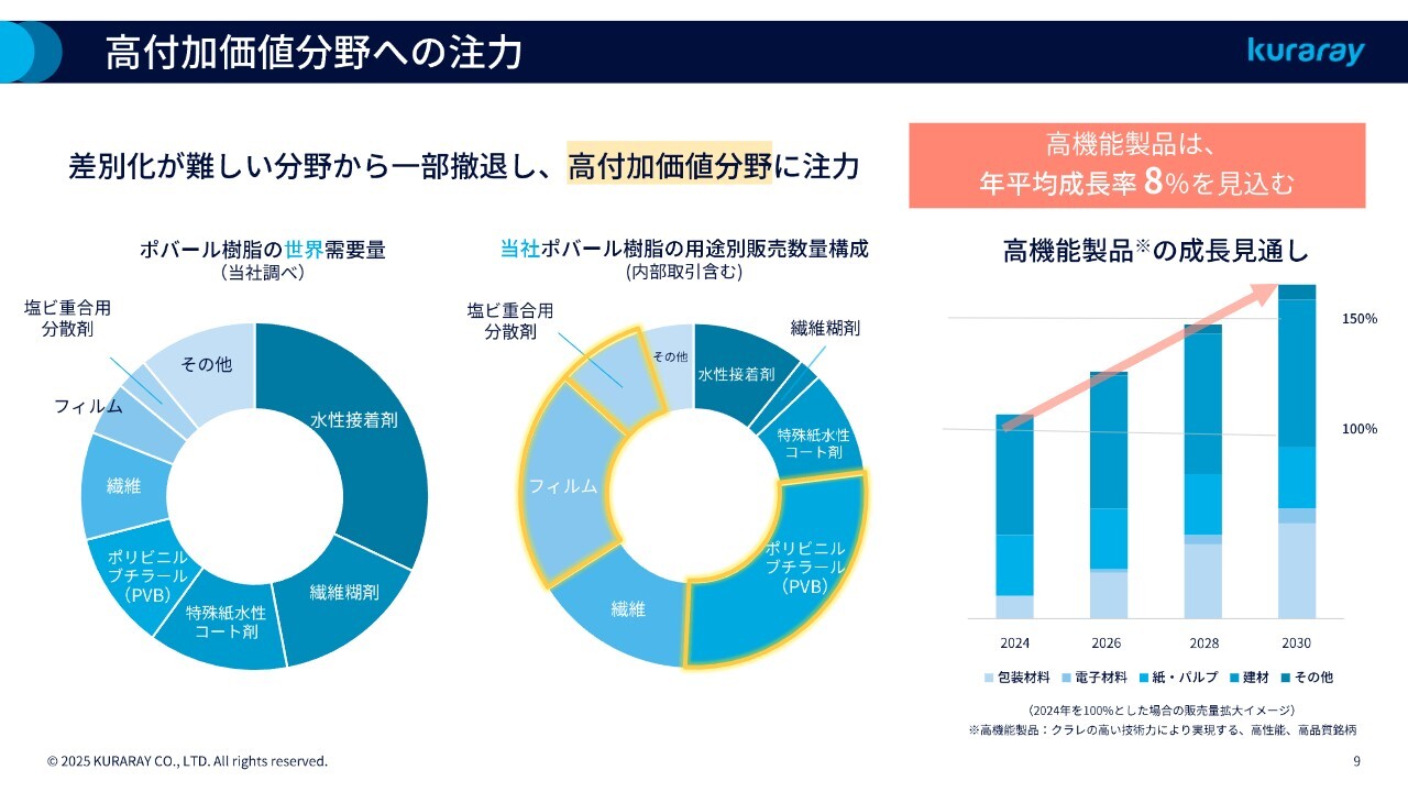 多くの長い歴史を持つものと同様に、ポバール樹脂も歴史とともに汎用化が進み、差別化が難しくなってきた用途もあります。ただ、当社の場合は、そのような付加価値の低い用途はすでに撤退し、黄色の枠線で示した付加価値が高い用途に注力しています。