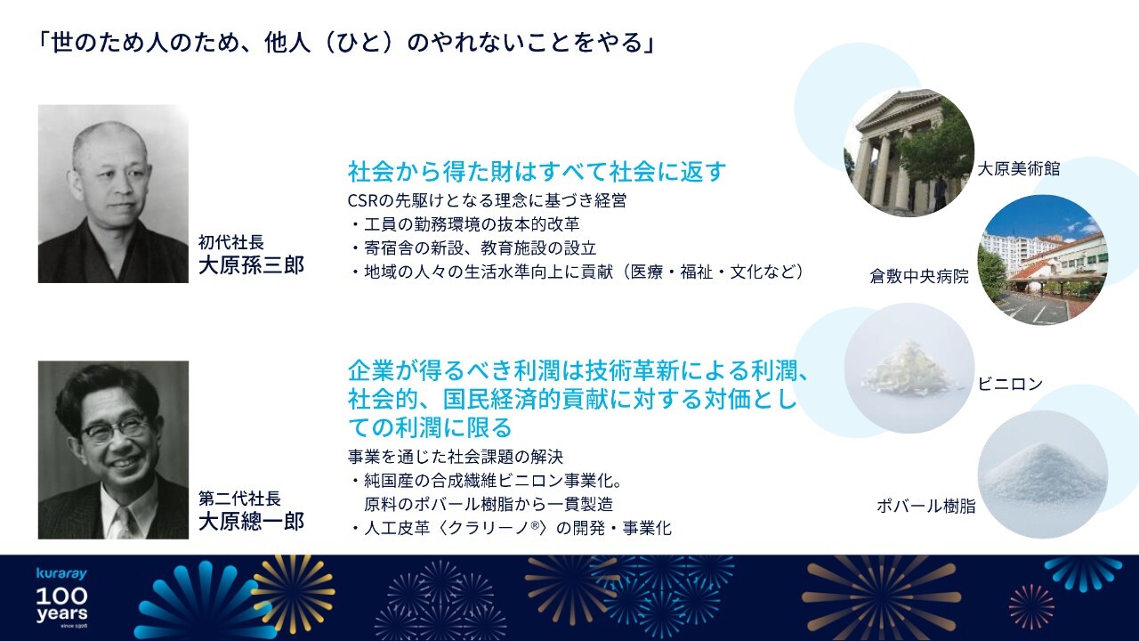 初代社長の大原孫三郎は、事業を通じて社会課題を解決すると同時に、「社会から得た財はすべて社会に返す」というCSRの先駆けとなる理念に基づいた経営を行っていました。地域住民の生活向上を願って建てられた病院や美術館、ホテルなどは、当社の創業の地である倉敷の現在を形作り、今に受け継がれています。