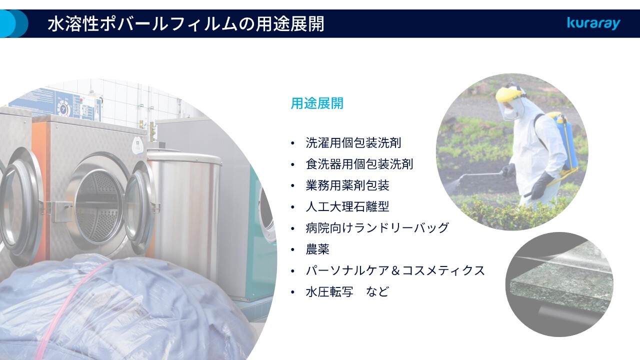 滝沢:ここからは注力事業をご紹介します。本日ご紹介する事業は、いずれもコアビジネスであるビニルアセテートセグメントに関するものです。ビニロンの原料として当社が世界で初めて工業化したポバール樹脂、および、これをフィルム化して個包装洗剤などに使われる水溶性ポバールフィルムとなります。