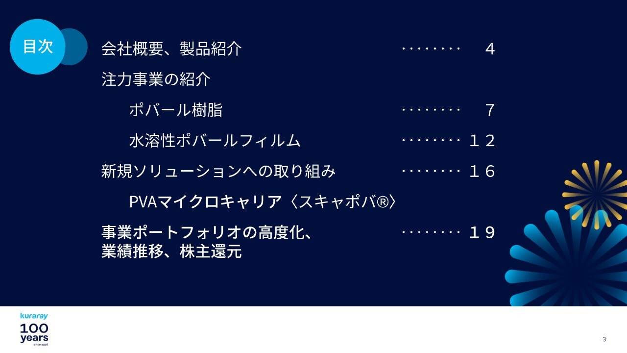 本日は当社の創立期である約100年前から、現在のコアビジネスであるビニルアセテート関連製品の発展にどのようにつながってきたのか、また次の100年に向けどのように成長していくのかについて、わかりやすくご説明したいと考えています。どうぞよろしくお願いします。