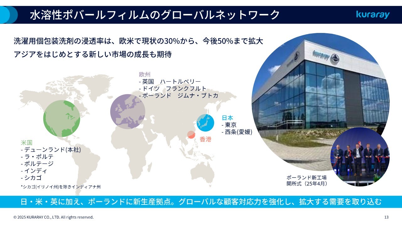 また、ポバール樹脂と同じく適地生産・適地販売の観点から、既存の生産拠点である日本、アメリカ、イギリスに加え、ヨーロッパへの展開としてポーランドに新たな生産拠点を設け、今年4月に開所式を行いました。