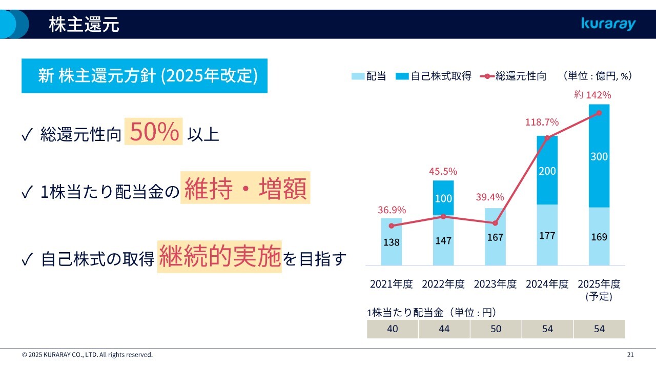 新たな還元方針として、「親会社株主に帰属する当期純利益に対する総還元性向50パーセント以上」「1株当たり配当金の維持・増額」「自己株式取得の継続的実施を目指す」を掲げています。この方針に基づき、2025年度の配当金は1株当たり年間54円を計画しています。