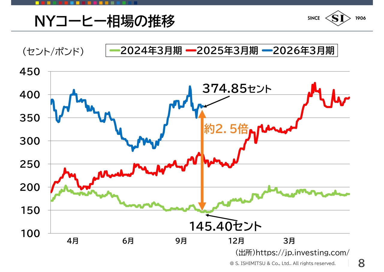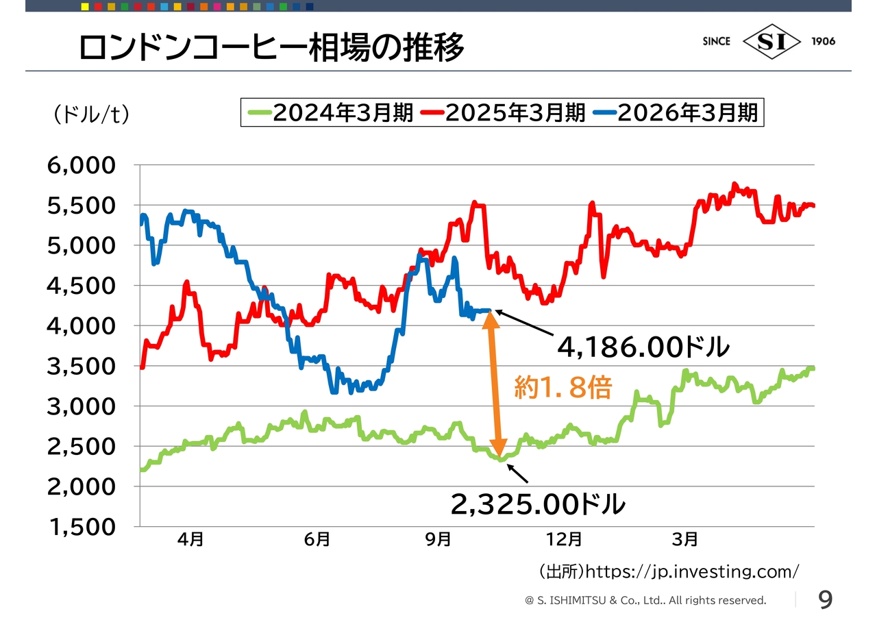 2024年3月期は、1トンあたり2,000ドルから3,500ドルぐらいでした。2025年3月期は3,500ドルから5,500ドル、現在はアラビカ種と同様に乱高下を繰り返しています。直近では4,000ドルを超えており、こちらも同じような背景となります。