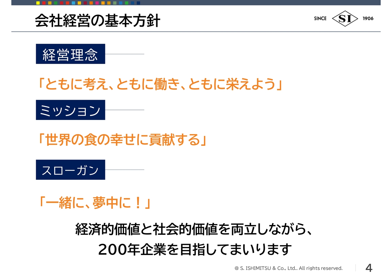 今年から私が社長に就任しましたが、スローガンとして「一緒に、夢中に!」を掲げています。当社は、経済的価値はもちろんのこと、世界の食の幸せに貢献するために社会的価値も両立させながら、200年企業を目指していきたいと考えています。