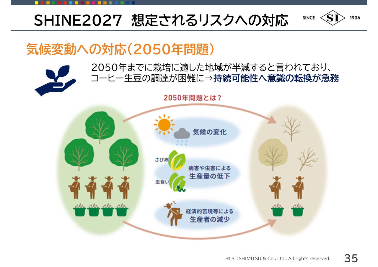 当社グループはコーヒーを主な商売の1つとしています。我々の1つのミッションとして気候変動をいかに減らすか、そしてコーヒーの栽培を維持できるかというところにチャレンジしなければいけないと考えています。