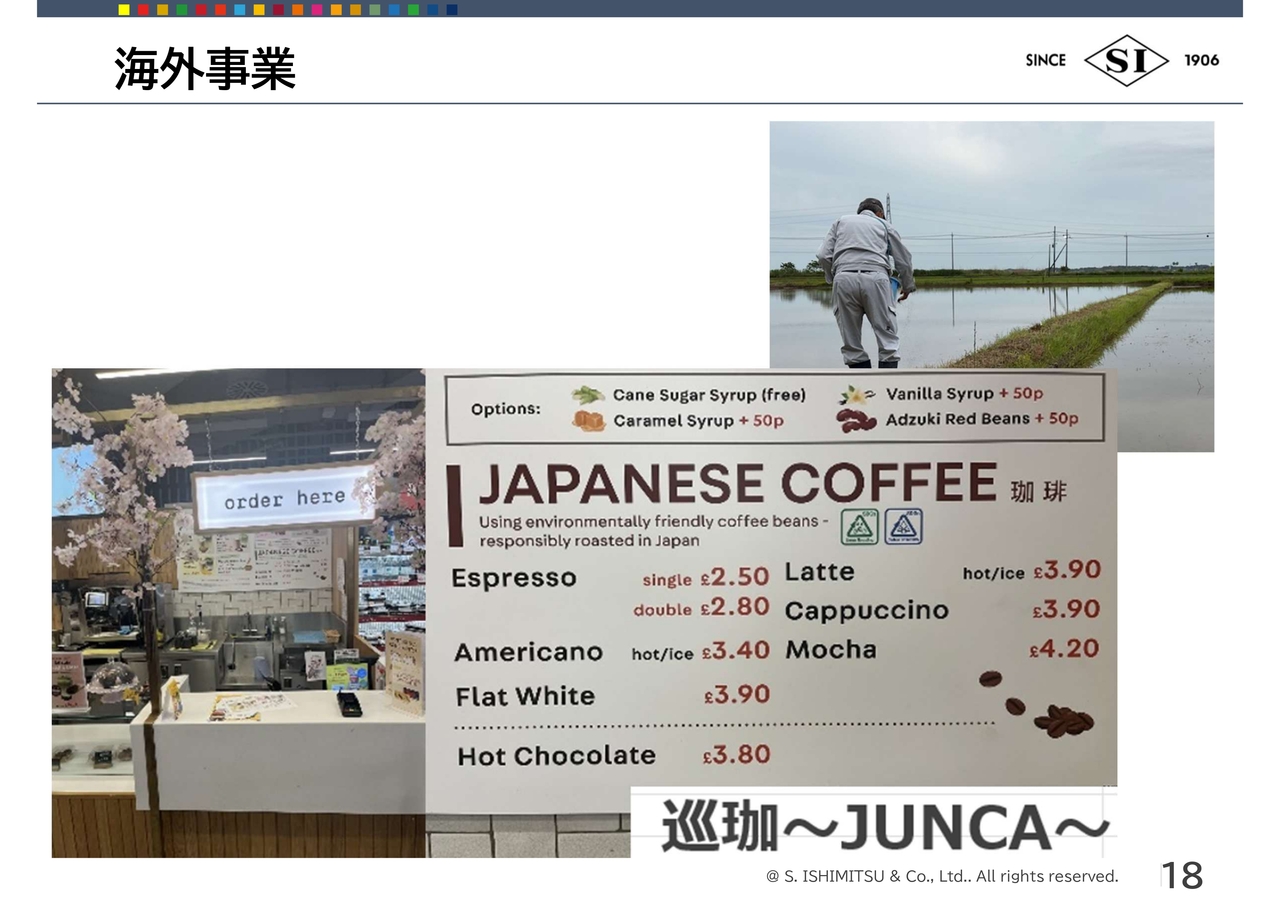 石光商事グループのアライドコーヒーロースターズという連結子会社では、自然に優しい「グリーン焙煎」を行った商品をロンドンで販売しています。日本でも、「巡珈~JUNCA~」というブランド名で11月頃からの販売を予定しています。メイド・イン・ジャパンのコーヒーですが、社会的価値を乗せた商品の提供として先行的にトライを進めています。