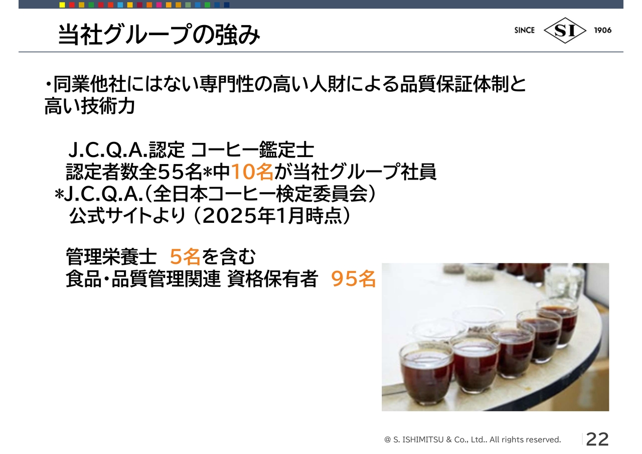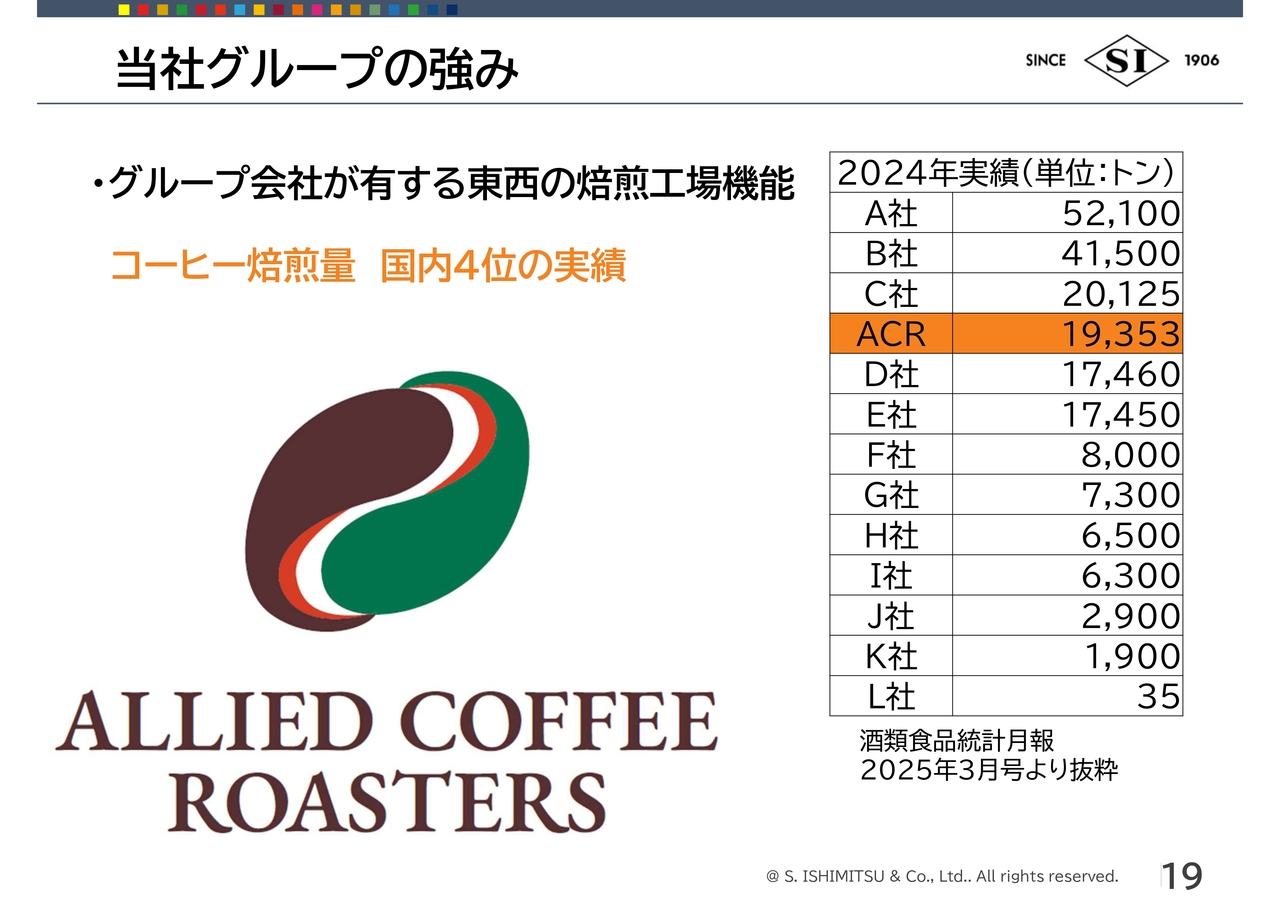 荒川:当社グループの強みをご説明します。1つ目は、連結子会社のアライドコーヒーロースターズについてです。こちらは現在、国内4位の焙煎量という実績を持っています。