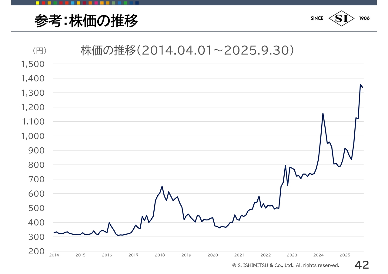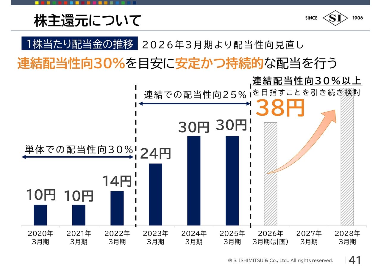 今中期経営計画が終わる2028年3月期には、連結配当性向を30パーセント以上にしたいと考えています。単年度の業績だけで配当性向を決めるのではなく、前期・当期の実績に来期の見通しを含めた3期の業績で、配当性向を安定的に出していければと考えています。