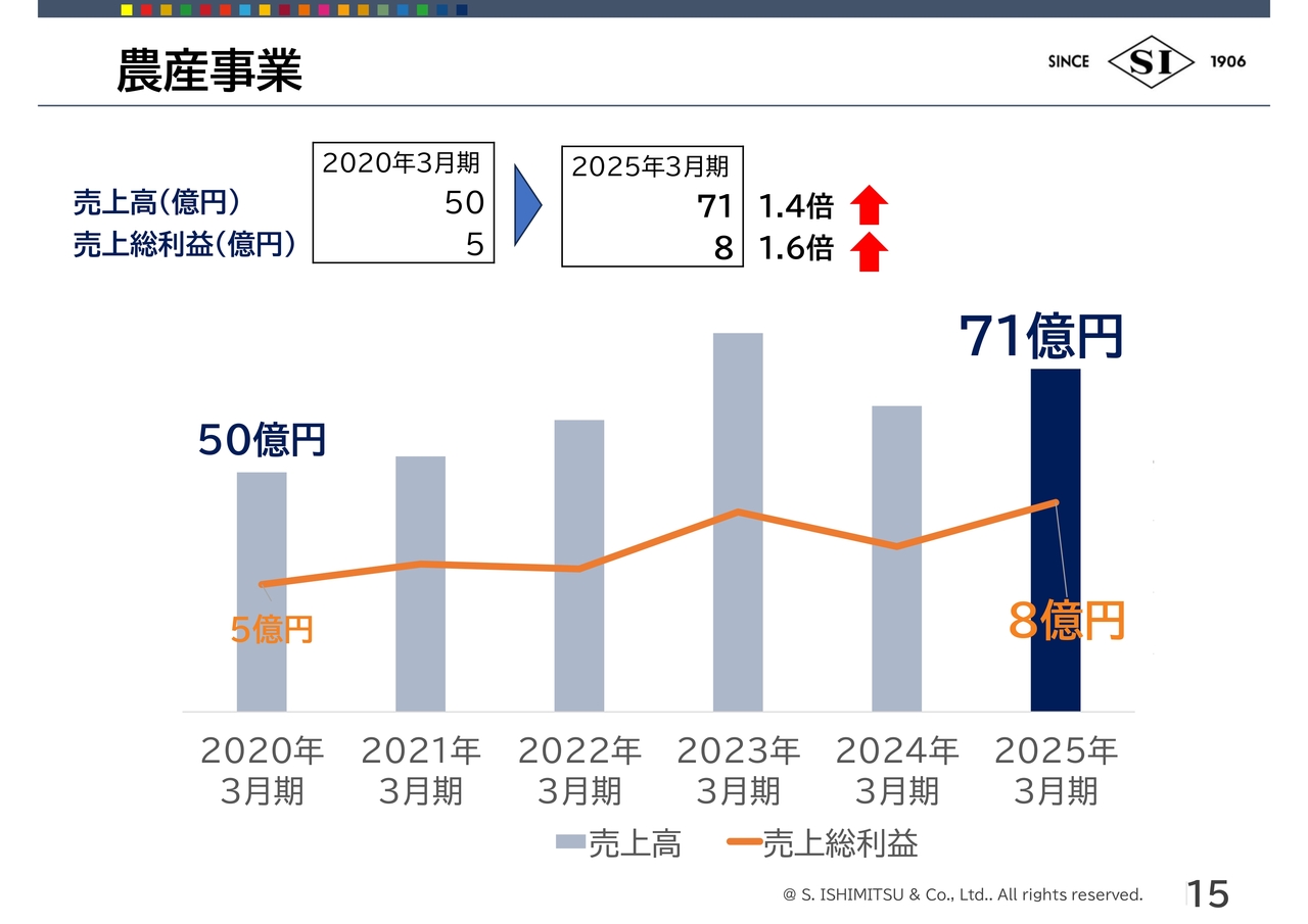 荒川:農産事業です。売上高は2020年3月期比で1.4倍の71億円、売上総利益は1.6倍の8億円となりました。過去6年間はスライドのようなかたちで推移しています。