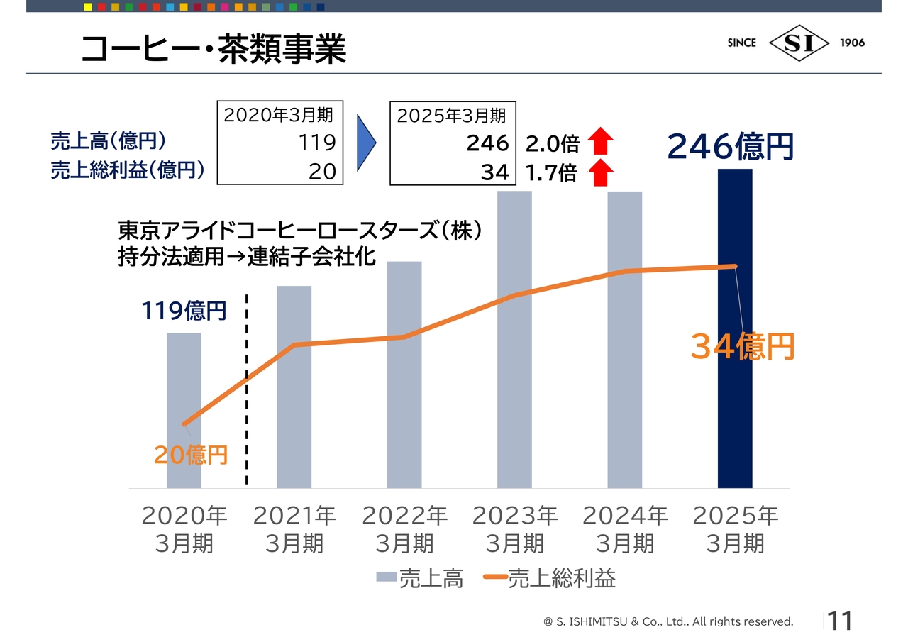 荒川:事業別の業績推移についてご説明します。コーヒー・茶類事業は、2020年3月期比で売上高が約2倍の246億円、売上総利益が1.7倍の34億円となりました。