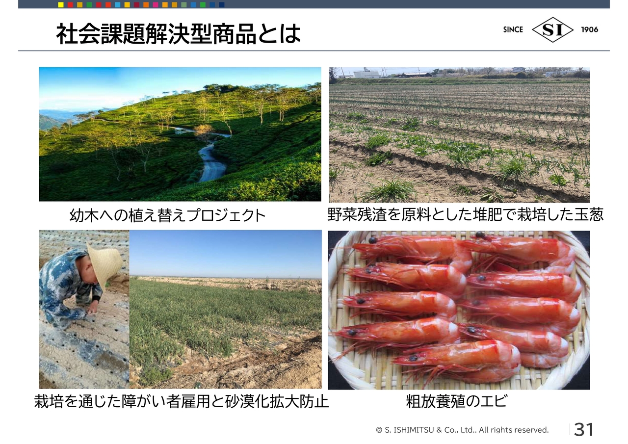 また、左下の写真にあるように、タマネギ栽培による中国の砂漠化防止や障がい者の雇用機会を創出する取り組みも行っています。