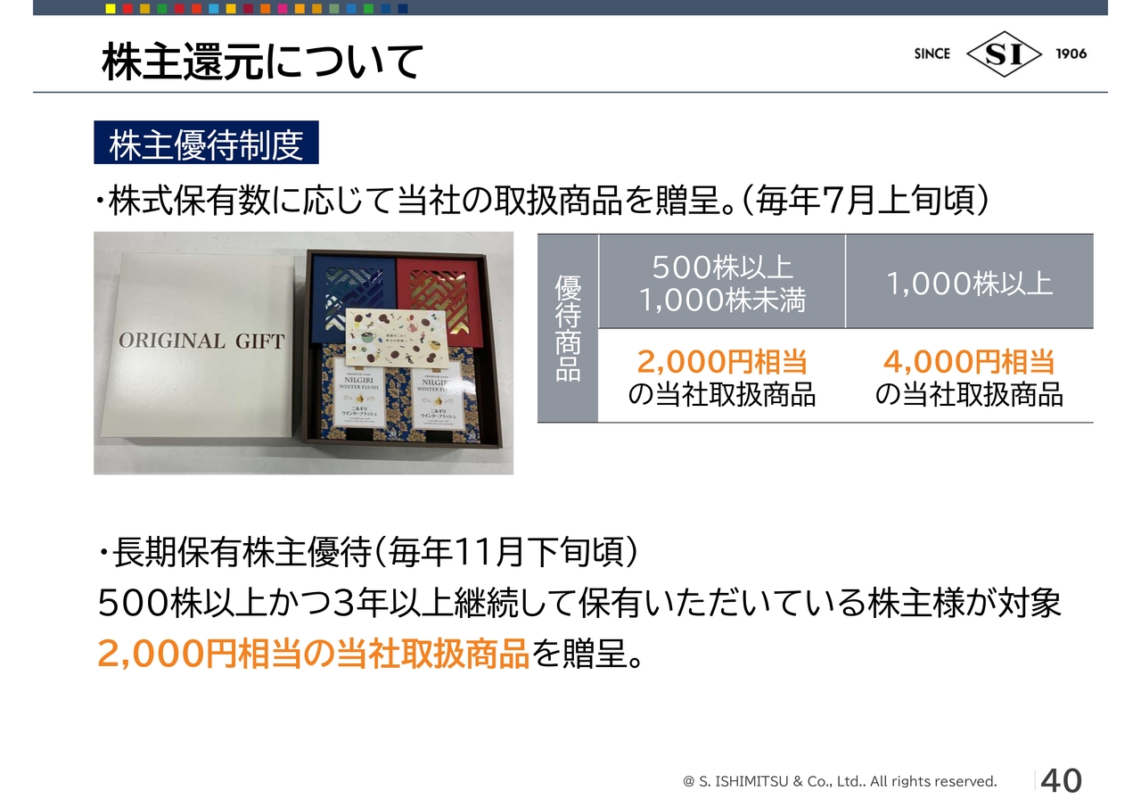 また、長期保有株主優待として、500株以上かつ3年以上継続して保有いただいている株主さまを対象に2,000円相当の当社取扱商品を贈呈しています。