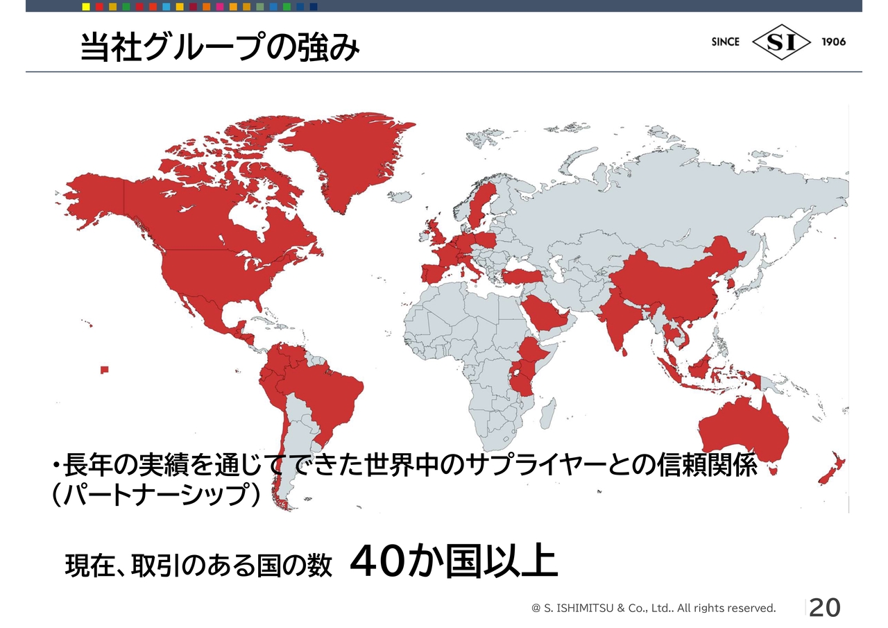 荒川:2つ目の強みは、サプライチェーンパートナーが海外に幅広くいることです。現在、当社が取引のある国の数は、販売と仕入先を含めて40ヶ国以上になります。すでに10年、20年以上取引のあるパートナーが世界各国にいることがおわかりいただけると思います。