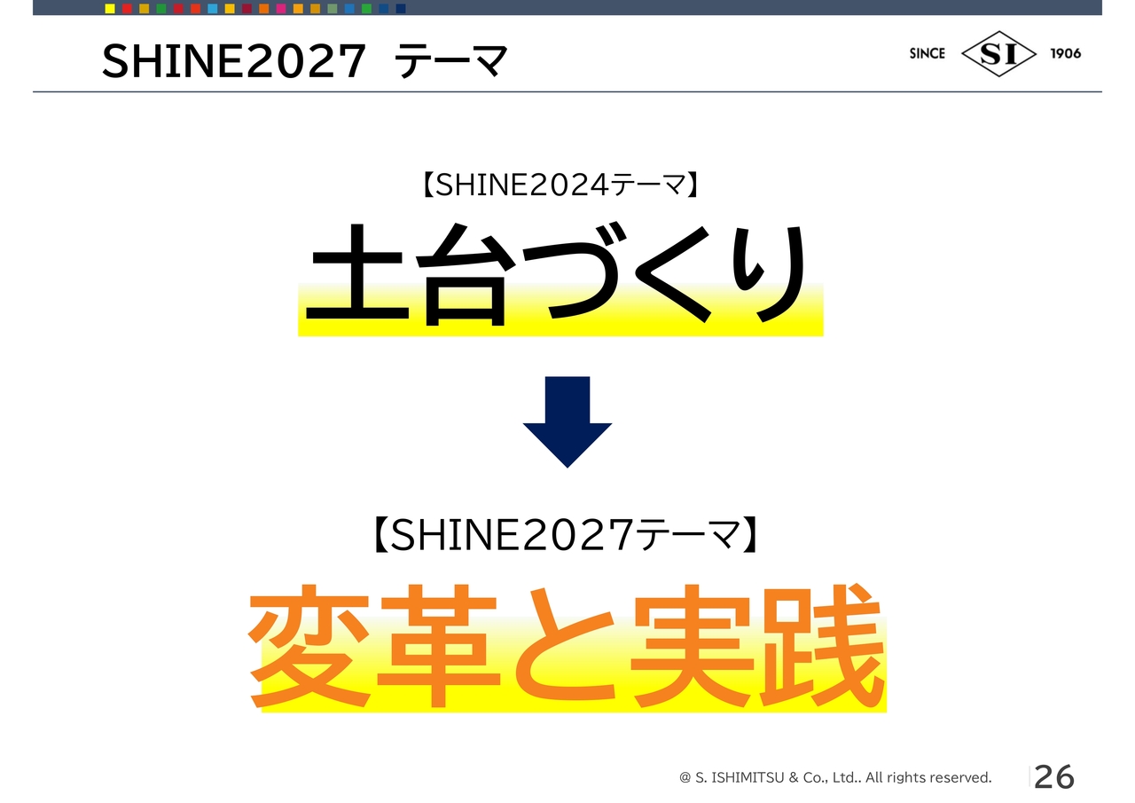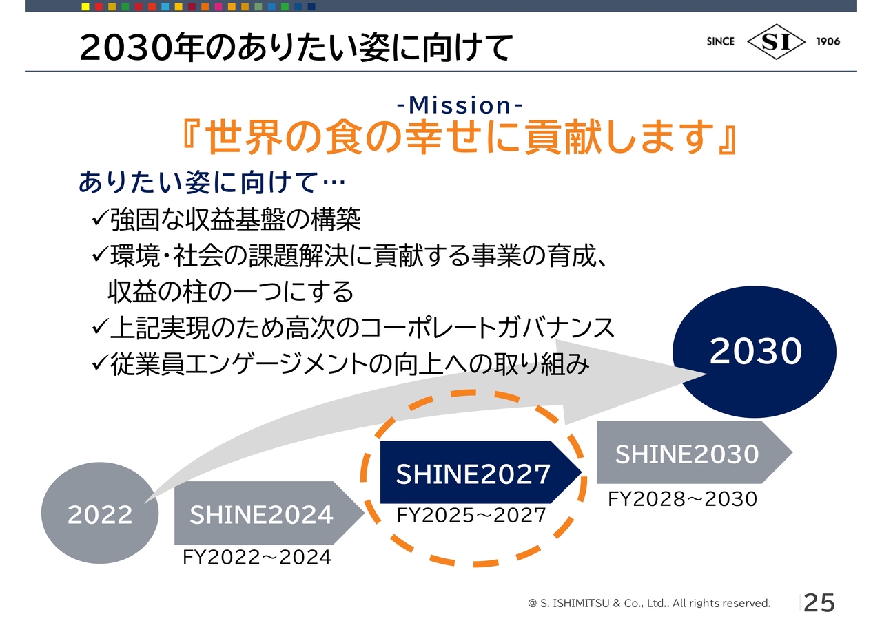 そうなるために、2022年から「SHINE2024」「SHINE2027」「SHINE2030」という3回の中期経営計画に取り組み、今は「ホップ・ステップ・ジャンプ」のうち「ステップ」に当たるところになります。