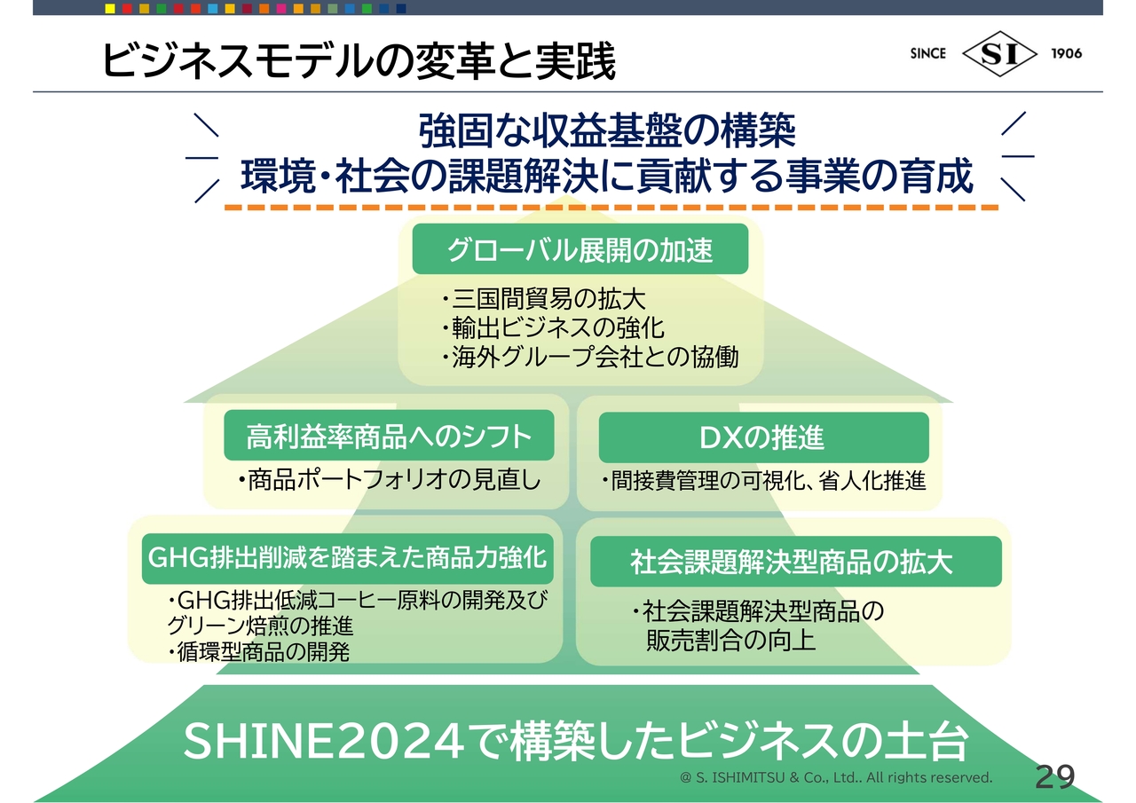 荒川:ビジネスモデルの変革と実践についてです。強固な収益基盤の構築、環境・社会の課題解決に貢献する事業の育成ということで、「SHINE2024」で作ったビジネスの土台をもとに変革と実践を進めていきます。