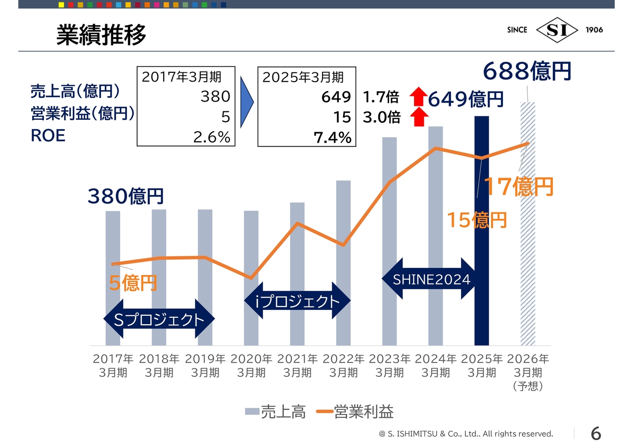 2017年3月期は、売上高380億円、営業利益5億円でしたが、2025年3月期は売上高が1.7倍の649億円、営業利益が3倍の15億円となりました。2026年3月期は、売上高688億円、営業利益17億円と見込んでいます。