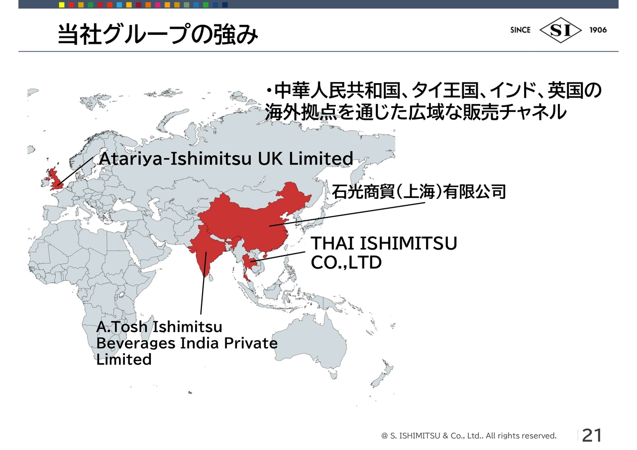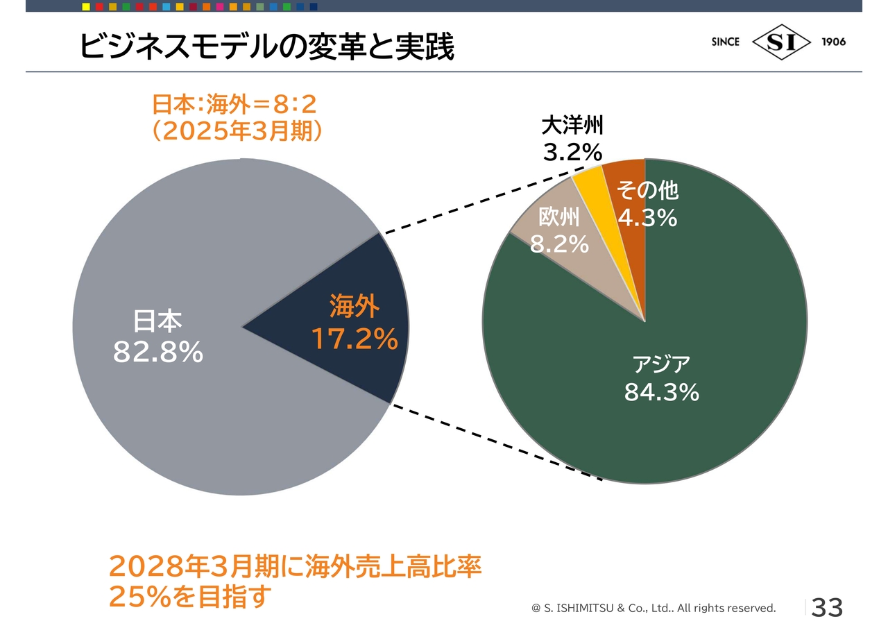 荒川:現在は、売上の17.2パーセントを海外が占めていますが、2028年3月期には25パーセントを目指しています。今はアジアが84.3パーセント、欧州が8.2パーセントとなりますが、アジアは中国の石光商貿がある上海を、欧州はロンドンを拠点として海外展開を加速していきたいと考えています。