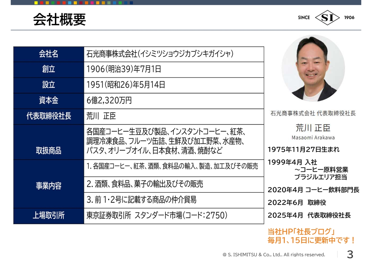 荒川正臣氏(以下、荒川):本日はお忙しい中、お時間をいただきありがとうございます。石光商事株式会社代表取締役社長の荒川と申します。本日は限られた時間ですが、どうかお付き合いください。よろしくお願いします。
