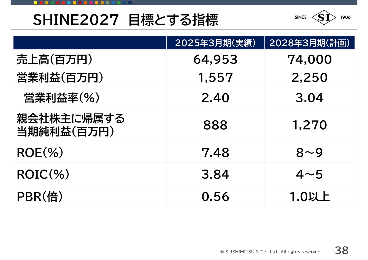 荒川:目標とする指標については、営業利益22億5,000万円、営業利益率3.04パーセントを掲げています。親会社株主に帰属する当期純利益は12億7,000万円、ROEは8パーセントから9パーセント、ROICは4パーセントから5パーセント、PBRは1倍以上を目標としています。