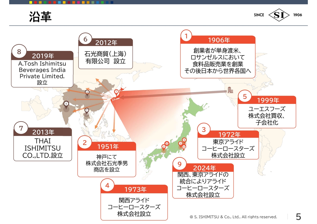 荒川:当社の沿革です。1906年にロサンゼルスで創業し、帰国してからはコーヒーや食品の市場にビジネスを拡大してきました。その後は海外にも進出し、現在は中国の上海、タイのバンコク、インドなどでも事業を展開しています。