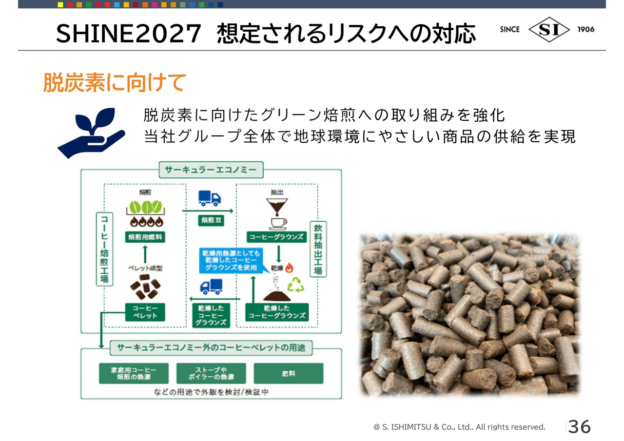 3つ目は、「グリーン焙煎」という社会課題に向き合ったコーヒー商品を、社会価値の乗った商品として、世界に先駆けて販売展開していきます。また、そのノウハウを含めて展開します。この3つの柱を通じて、海外比率を増やしていきたいと考えています。